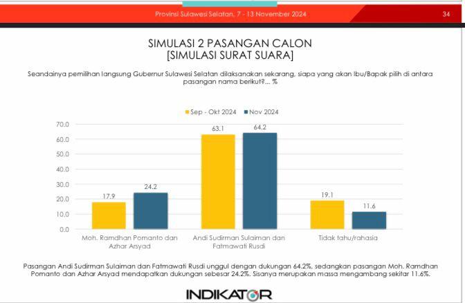 Lembaga survei nasional dengan kredibilitas terpercaya ini mencatat, paslon Andi Sudirman-Fatma jauh melejit dalam perolehan elektabilitas, yakni 64,2 persen. Sedang pesaingnya, paslon Danny Pomanto-Azhar Arsyad jauh tertinggal dan hanya memperoleh elektabilitas 24,2 persen. Sementara responden yang belum menentukan pilihan tersisa 11,6 persen. Trend ini menunjukkan adanya kenaikan signifikan elektabilitas Andalan Hati dibanding survei Indikator bulan Oktober yang berada di angka 63,1 persen.
