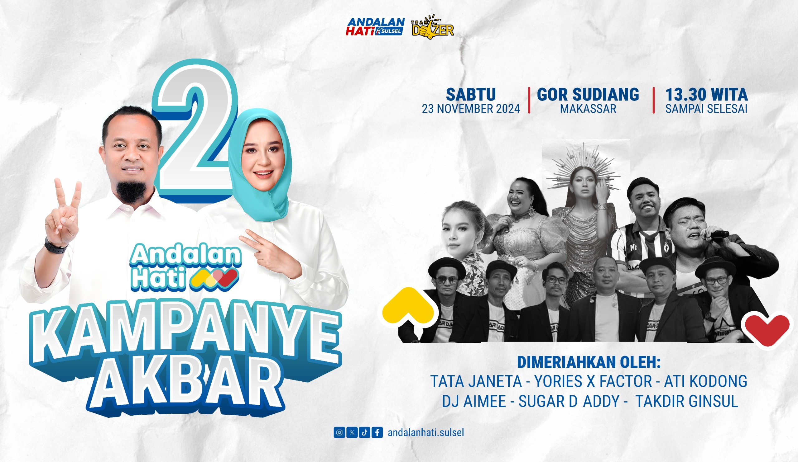 Kampanye Akbar akan dimeriahkan oleh DJ Aimee, Aty Kodong, Tata Janeta, Yories X Factor, Sugar Daddy, dan Takdir Ginsul.