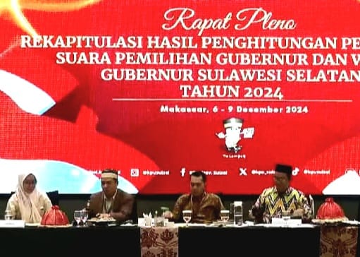 “Memutuskan, menetapkan keputusan Komisi Pemilihan Umum Provinsi Sulawesi Selatan tentang hasil pemilihan Gubernur dan Wakil Gubernur Sulawesi Selatan tahun 2024. Keputusan ini mulai berlaku sejak tanggal ditetapkan Makassar pada tanggal 8 Desember 2024,” seru Ketua KPU Sulsel, Hasbullah, dan langsung mengetukkan palunya.