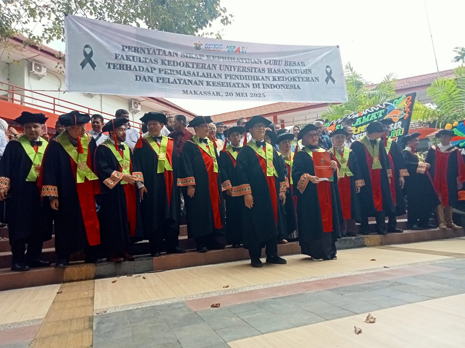 SENATORNEWS.ID, MAKASSAR – Puluhan Guru Besar Fakultas Kedokteran Universitas Hasanuddin (UNHAS) mengungkapkan keprihatinan mereka terhadap kebijakan kesehatan nasional yang dinilai mengancam kualitas pendidikan dan pelayanan kesehatan. Pernyataan ini disampaikan di pelataran Fakultas Kedokteran UNHAS, dipimpin oleh Ketua Senat Akademik FK UNHAS, Prof. Anis Irawan Anwar.